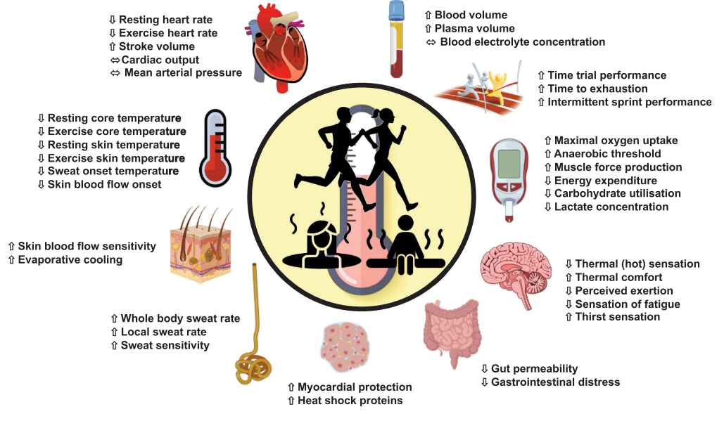 Ambas estrategias inducen a una adaptación fisiológica y atenúan las disminuciones de rendimiento causadas por los competiciones con ambientes muy calurosos. Las principales adaptaciones fisiológicas se producen en el cuerpo humano en diferentes niveles; Adaptaciones sanguíneas (mayores niveles de plasma), Mayor tolerancia a competir en ambientes calurosos, menor permeabilidad intestinal, Mayor protección miocárdica, adaptaciones de procesos termorreguladores como aumento en las tasas de sudoración, adaptaciones cardiovasculares y mejores adaptaciones centrales y periféricas a nivel de temperatura 3.