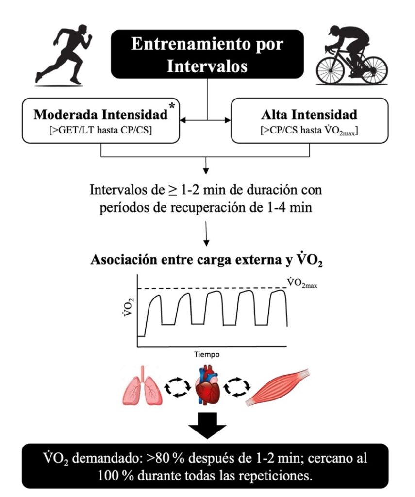 En línea con lo anterior, una revisión reciente de Festa et al. [22] propone utilizar intervalos de al menos 1–2 min de trabajo en HIIT para asegurar una estrecha asociación entre la potencia o velocidad aplicada y la demanda metabólica reflejada en el V̇O2, criterio también aplicable a intervalos de intensidad moderada. Esta duración coincide con las fases I y II de la cinética del V̇O2, durante las cuales se alcanza >80 % de su amplitud total a intensidades moderadas y altas. De manera complementaria, cuando se prescriben intervalos muy cortos (<1 min), se sugiere incorporar al inicio de la sesión intervalos más largos (>1–2 min) para evitar un retraso en esta asociación. Asimismo, se proponen pausas de 1–4 min según el objetivo de la sesión, preferentemente pasivas, aunque se destaca que la duración e intensidad del intervalo de trabajo resultan más determinantes que la recuperación para lograr este objetivo. La figura 2 resume su aplicación práctica.