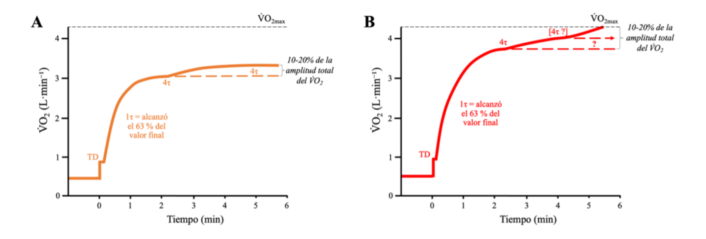 Figura 1. Dinámica del V̇O2 durante ejercicio de intensidad moderada [A] y alta [B]. El 80–90 % de las fases I y II se alcanza aproximadamente entre 1 y 2 min tras el inicio del ejercicio. TD: retraso temporal (fase I); τ: constantes de tiempo de la fase II y del componente lento (1τ = alcanzó el 63 % del valor final). Figura adaptada de Scheuermann et al. [21] y reproducida con permiso de Festa et al. [22].