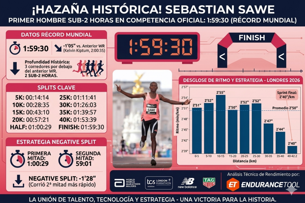 El domingo 26 de abril, Sabastian Sawe, de Kenia, se convirtió en la primera persona en romper la barrera de las 2 horas en un maratón oficial, al correr un asombroso 1:59:30 en el Maratón de Londres 2026.