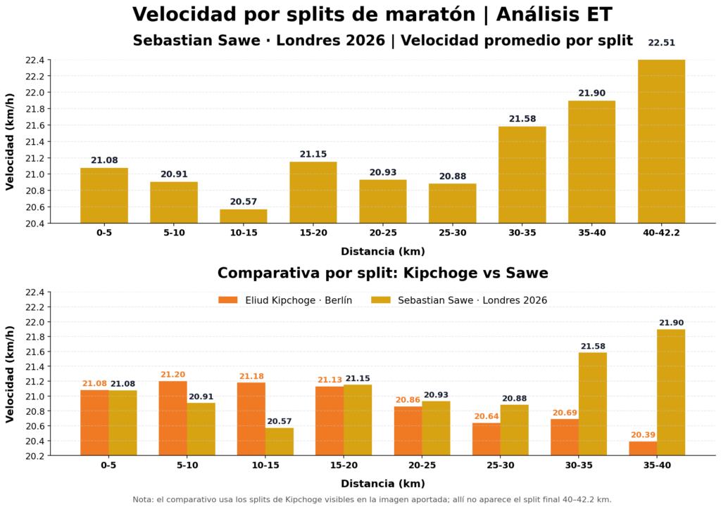 Es notable analizar el pacing de Sawe para romper el récord mundial en Londres 2026 en comparación con el récord mundial de Kipchoge en Berlín 2022. Kipchoge fue más rápido que Sawe en el primer 21 km, no obstante su ritmo disminuyo en el segundo 21 km, mientras que el de Sawe aumento marcadamente, y el ritmo de cada split de 5 km fue bastante menor que el promedio de toda la competición.