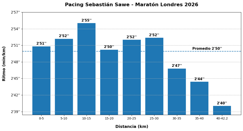 Figura 1. Ritmos promedio (en min:seg/km) cada 5 km del récord mundial de maratón de Sebastian Sawe en el Maratón de Londres 2026.