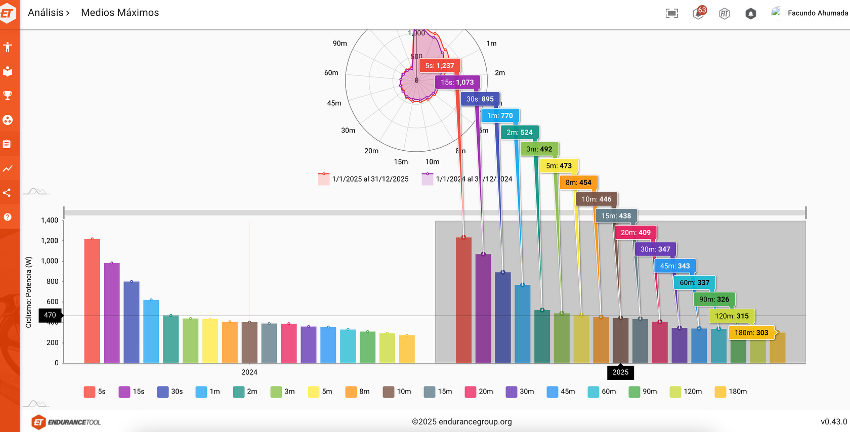 Figura 2. Récords de producción de potencia de 2025 desde 5 seg a 180 min. Datos de Endurance Tool.