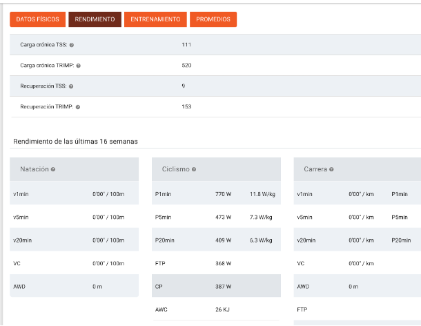 Figura 1. Récords de las ultimas 16 semanas y modelación de la potencia critica (CP) y FTP. Dashboard de datos de Endurance Tool para los atletas Premium.