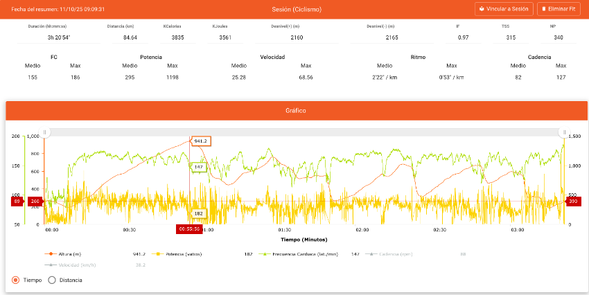 La NP de la competición tuvo un valor de 340 W (5,2 W/kg), mientras que la potencia media y máxima fueron de 295 y 1198 W, la cadencia tuvo un valor promedio de 82 rpm.