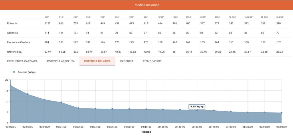 Los medios máximos alcanzados en 5 seg, 1, 5, 20, y 60 min, para la producción de potencia fueron de 17,3, 9,5, 6,5, 6,2 y 5,3 W/kg, respectivamente (Figura 4).